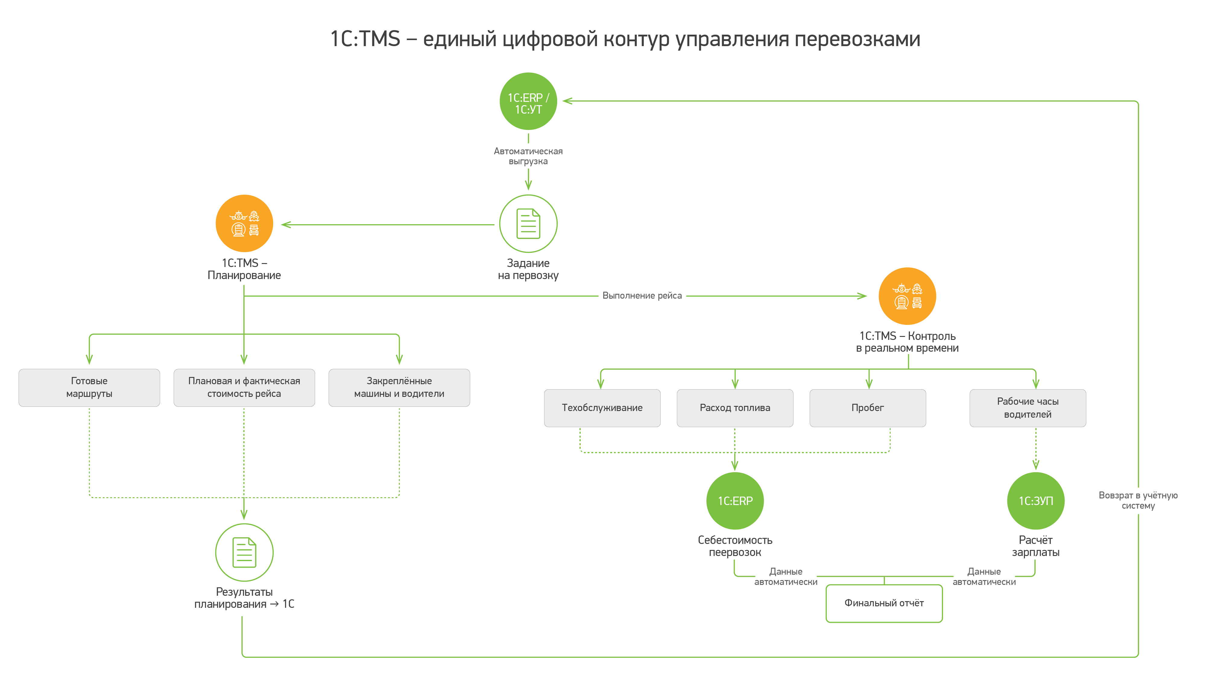 Все эти данные автоматически уходят в 1С:ЗУП для расчёта зарплаты и в 1С:ERP для формирования себестоимости перевозок. Руководство получает прозрачную финансовую картину без дополнительных запросов и сверок. Такой подход позволяет выстроить единый цифровой контур — от заявки на перевозку до финального отчёта. Данные не теряются, не дублируются и не требуют ручного переноса.
