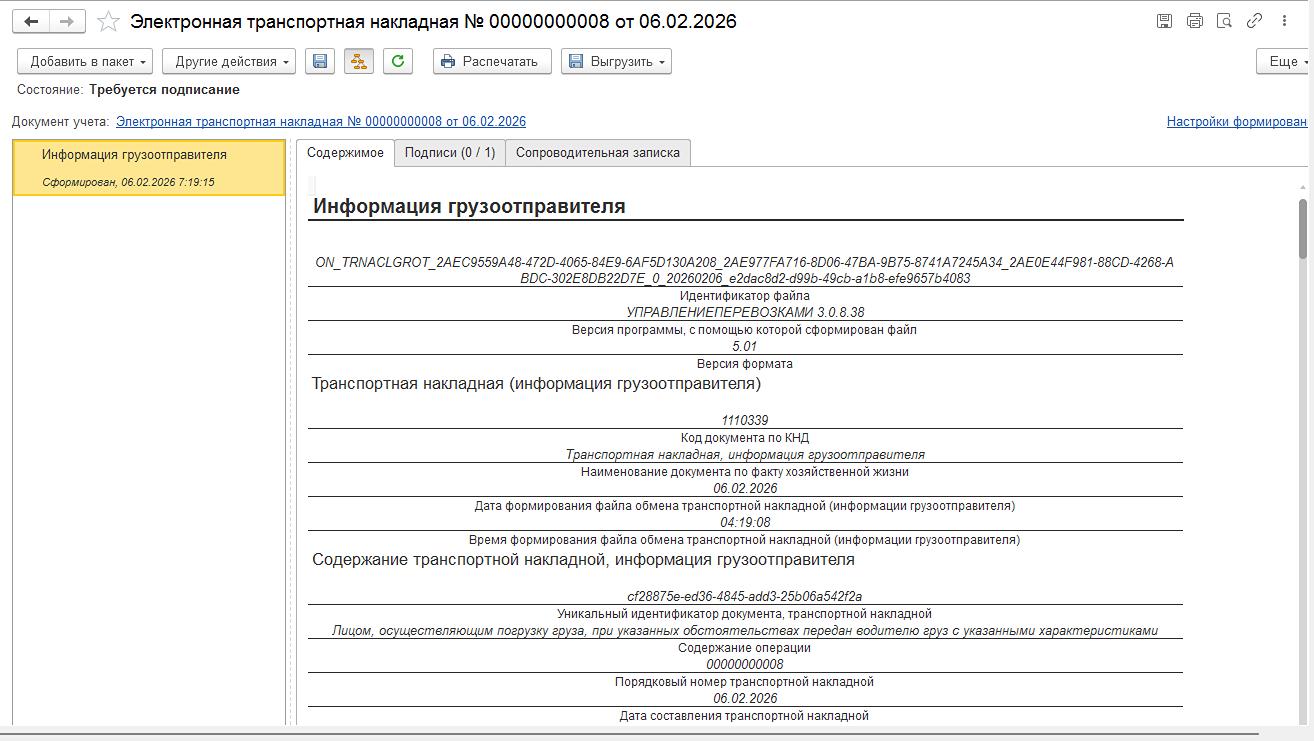 В «1С:TMS Логистика. Управление перевозками» реализован полный цикл работы с ЭТрН 2026:
